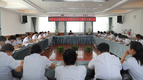 6月21日下午,来志斌副校长在校医院讲授题为《深学细悟 见行见效 以高度的纪律自觉保障服务学校高质量发展的行动自觉》党纪学习教育专题党课,吴芳芳书记主持会议,全体党员干部参加听讲。